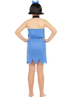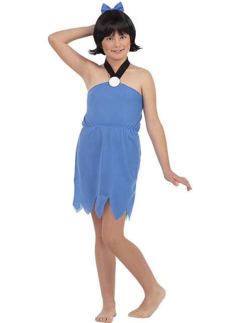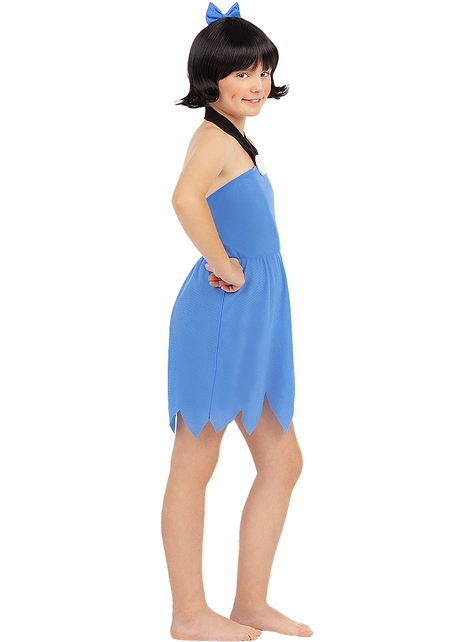 Le déguisement de Betty Rubble pour fille est composé d’une robe bleu clair comme celle de Betty Rubble accrochée autour du cou avec un ruban noir en guise de collier et avec la jupe terminée en pointes mais aussi une perruque noire avec la même coupe que Betty Rubble couronnée par un petit ruban bleu, assorti à la robe.