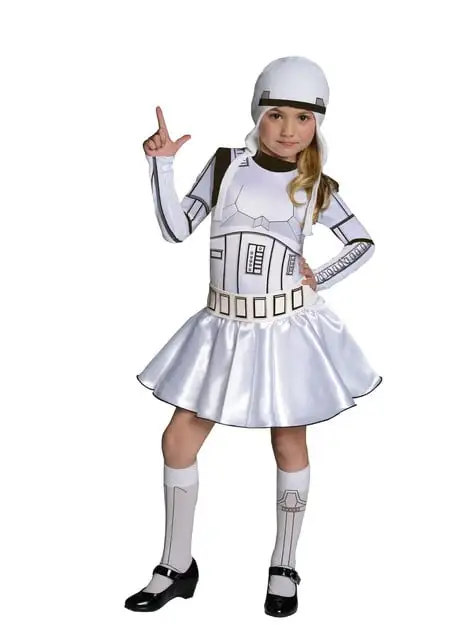Ce costume de Stormtrooper comprend une robe blanche avec des détails gris et noirs, un chapeau blanc, une ceinture blanche et des chaussettes grises.