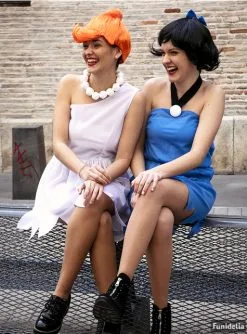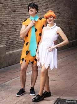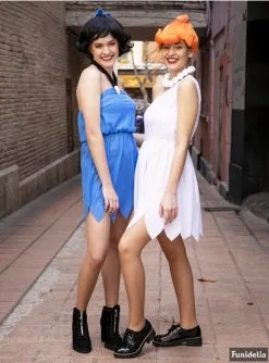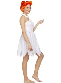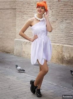 Cette robe de Wilma Pierrafeu est une reproduction de celle portée par le personnage du dessin animé. Elle se compose d’une robe blanche sans manches avec une seule bretelle. Avec la robe, un collier de grosses pierres blanches et une perruque rousse avec un chignon et un nœud, qui caractérise Wilma Pierrafeu.